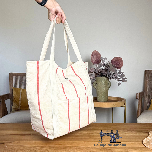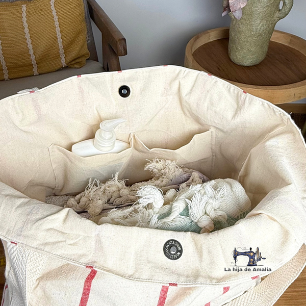 Interior: Lienzo mezcla algodón/ poliéster liso con doble bolsillo y cierre imantado.